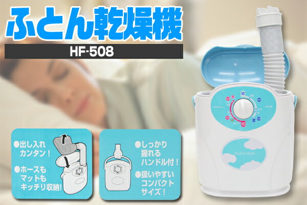お布団の湿気・花粉対策・ダニ退治に!★KANSAI 家庭用ふとん乾燥機(HF-508)洗濯物を乾燥したり、冬の寒い時におふとんを温めたりするのにもGOOD JOB♪価格: 3,480円レビュー評価: 0.0 レビュー数:0 KANSAI ふとん乾燥機(家庭用) HF-508 ジメジメした布団の湿気やダニ退治に便利なふとん乾燥機です! 他にも洗濯物を乾燥したり、冬の寒い時におふとんを温めたりするのにGOOD JOB♪ 花粉対策としてもとても効果的です。 家の中で簡単に乾燥できちゃうから昼間干せない人にも是非お勧めですよ! この1台で快適生活始めよう♪ 【仕様】 ■電源コード:耐熱ビニールコード1.9m ■安全装置:自動復帰式サーモスタット ■温度ヒューズ/ヒータ交流100V、50-60Hz ■消費電力:400Wー回路用 155℃動作 ■モーター用温度ヒューズ/155℃動作 ■乾燥容量:ふとん2枚(敷きふとん・掛けふ |